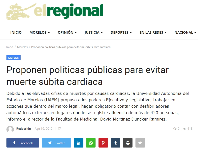 • Promotor de la iniciativa para implementar Espacios Cardioprotegidos con Desfibriladores Externos Automáticos (DAE) de acceso público para prevenir la Muerte Súbita Cardiaca (MSC) en el Estado de Morelos 1 | 2 | 3 • Asesor Técnico: Iniciativa con Proyecto de Decreto por el que se adicionan diversas disposiciones a la Ley General de Salud: Espacios Cardioprotegidos y Prevención de MSC en México • Iniciativa de Proyecto de Decreto avalado en el pleno del Senado de la República el 21 de septiembre del 2021 se reforman los artículos 57 y 163 y se adiciona el artículo 165 Bis de la Ley General de Salud. Espacios Cardioprotegidos y Prevención de Muerte Súbita Cardiaca en México. • "Legislación de Espacios Cardioprotegidos en México" - Foro legislativo: "Avances y Retos en la Atención de la Enfermedad Vascular Cerebral y el Infarto Agudo de Miocardio en el Sistema de Salud Mexicano" Senado de la República • Foro Legislativo: Avances y retos en la atención de la Enfermedad Vascular Cerebral y el Infarto Agudo de Miocardio en el Sistema de Salud Mexicano. Senado de la República • Legislación de Espacios Cardioprotegidos en México. Coordinación Estatal de Protección Civil Morelos. "Acciones que Salvan Vidas" https://fb.watch/iqp1KiJ0E5/ • "Conversaciones de salud pública" Espacios cardioprotegidos su papel en la prevención de la MSC. • "Foro de Insuficiencia Cardiaca" Espacios cardioprotegidos Comisión de Salud - LXV Legislatura Diputados. |